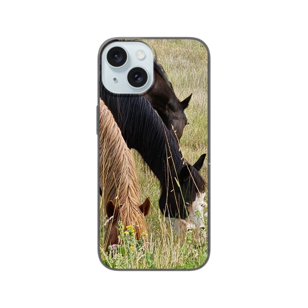 Two horses grazing in a grassy field, one with a light brown coat and the other with a black-and-white coat.